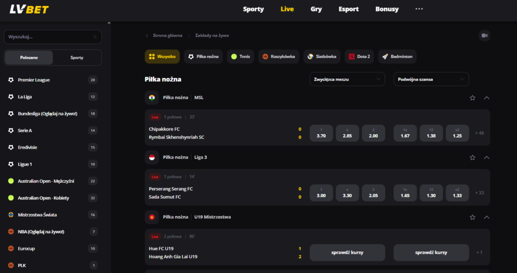 LVBet oferuje zakłady na niemal każdą popularną dyscyplinę sportową, od piłki nożnej po sporty niszowe, jak dart czy rugby. Dla fanów zakładów na żywo dostępne są dynamiczne kursy oraz transmisje na żywo dla wybranych wydarzeń. Dodatkowo, funkcja Bet Builder pozwala na tworzenie złożonych kuponów z wielu zdarzeń, zwiększając możliwości gry.